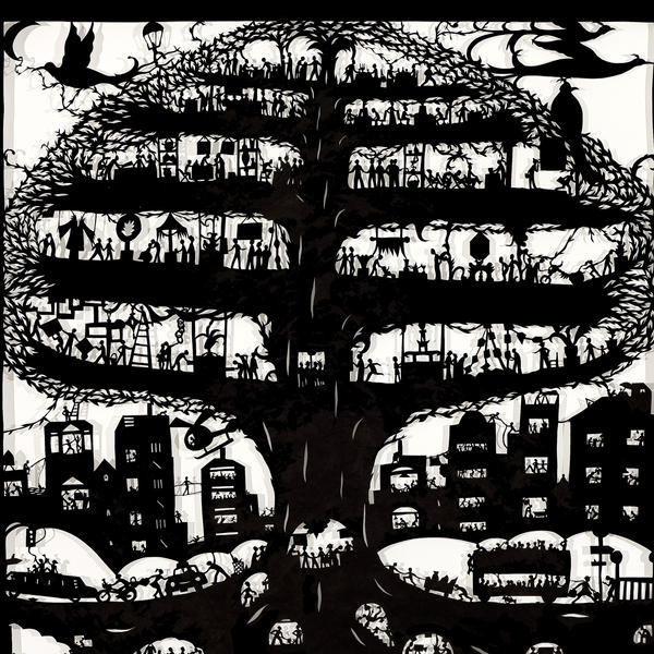 As you walk up the stairs, you’re greeted by Beatrice Coron’s intricate cutout images. The tableaux look to me something like a Day of the Dead celebration reimagining Hitchcock’s Rear Window. Skeletal black-and-white figures work, eat, dance, and climb over branches or through tunnels, depending on whether the world holding them is a web, globe, or tree.