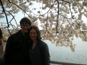 So Andrew and I have been going to see the cherry blossoms in D.C. every year for the past three years. The first year we went, we were giddy because he had just come back from three months in England the day before. The second year it rained, we went after peak season, and I sprained my foot from the sheer amount of walking we did, but it was still fun–we huddled by the hot chocolate stand when we got too damp, took strategic close-up photos of remaining blossoms so photo evidence would look lusher than what we actually saw, and he offered to carry me back to the Metro station. This year was the third year, and, unfortunately, my schedule was super-full, and we didn’t get to go.